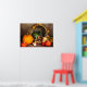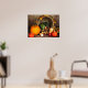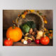 Poster avec la photo d'une récolte d'action de grâce, posé sur une table en bois rustique. Citrouille, pommes de terre, courge etc... composent cette belle collection de nourriture. Des feuilles d'automne colorées entourent le panier de la cornucopie.