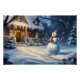 Un tableau d'hiver agréable, coloré, d'un bonhomme de neige devant une maison.