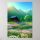 Cette scène époustouflante présente un étang serein entouré d'herbe verte et de belles fleurs roses, avec un temple japonais traditionnel assis paisiblement en arrière - plan. Au loin, les montagnes verdoyantes et vallonnées offrent un cadre pittoresque, avec le soleil qui les entoure.