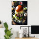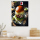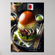 Laissez-vous tenter par le délicieux hamburger japonais Teriyaki pour savourer un délicieux goût de Tokyo. Une pâté de boeuf de qualité supérieure, glacée avec une sauce teriyaki riche et salée, est garnie d'un wasabi mayo délicat, de choux râpé croustillant et le tout niché dans un petit pain de farine de riz torréfié. Un petit drapeau japonais apporte une touche d'élégance, tandis que des baguettes se reposent à côté de l'assiette, complétant ce chef-d'oeuvre culinaire.