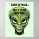 Éclairez votre espace grâce à cette affiche ludique avec une tête d'alien verte joyeuse, qui se broie abondamment avec ses dents. Son expression amicale et la légende "I Come in Peace...and a Little mischief" exsument un sentiment d'amusement et de méfait, ce qui en fait l'ajout parfait pour tous les amateurs de science-fiction ou ceux qui aiment rire.