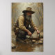 A bearded man wearing a hat is panning for gold in a shallow stream surrounded by autumn foliage. The scene has a peaceful, nostalgic feel with soft natural tones and a misty background.