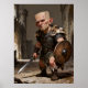 A ugly warrior stands in an ancient stone fortress holding a sword and shield. The setting is medieval, with towering castle walls in the background.