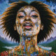 "Golden Soul, Infinite Skies". A radiant Afro-modern woman surrounded by golden and cosmic details symbolizes strength and spiritual transcendence. Blending abstract and surreal elements, this piece exudes inspiration and positivity, with the woman's smile representing hope, and inner strength for a brighter, united tomorrow.