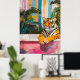 Découvrez un tableau minimaliste captivant d'un tigre en vous relaxant dans une baignoire, dans un décor de jardin tropical animé. Cette affiche à grande échelle présente des couleurs audacieuses, des éléments graphiques et des lignes expressives, créant ainsi une pièce murale unique et sophistiquée.