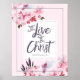 La typographie de calligraphie est conçue en lettres noires élégantes, avec des glyphes et des alternatives fantaisistes, et on peut lire : "Vivre est le Christ." L'écriture est de Philippiens 1:21. Le design est entouré d'une belle armature de fleurs aquarelle et d'une bordure rectangle blanche avec garniture.