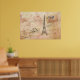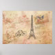 Tour Eiffel vintage art du printemps à Paris avec de jolies fleurs de cerisiers roses en arrière - plan, la Tour Eiffel et des illustrations d'antiquités à vélo, un vieux feuillet de chansons appelé "Paris au printemps", des papillons, une hirondelle portant une lettre d'amour, et des lettres postales rétro avec une marque postale de l'époque. Des tourbillons floraux complètent ce design girly vintage de Paris romantique au printemps. J'aime Paris au printemps...et toi ?