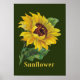 Joli tournesol doré. Cette jolie fleur a des jaunes et des verts riches pour un effet champêtre frais. Poster a un arrière - plan vert profond et le texte en jaune dit tournesol.