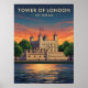 A picturesque illustration of the historic Tower of London with a vibrant sunset sky and its reflection shimmering on the water.
