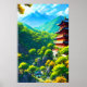 Art paisible avec un palais chinois entouré de montagnes et de nature.