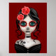 Ce design unique présente une fille triste avec deux roses rouges dans les cheveux. De grands yeux turquoise et une petite bouche cousue donnent au design un look très stylisé et magnifique. Des fils de cheveux noirs longs se déversent de la tête des filles vers la peau blanche pâle sur la poitrine. Les yeux des filles sont entourés de grands cercles noirs et de simples pédales de fleurs dans le style des crânes de sucre du Jour des Morts. Trois roses noirs de tribus avec des feuilles et des lignes tourbillonnantes sont tatoués sur l'épaule des filles qui fait écho aux fleurs dans ses cheveux.