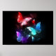Trois papillons lumineux, rouges, violets, verts, texturés, nocturnes sur arrière - plan noir lumineux.