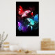 Trois papillons lumineux, rouges, violets, verts, texturés, nocturnes sur arrière - plan noir lumineux.