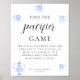 Un élégant baby shower à thé pour bébé "trouver la pacifier" signe de jeu avec un thé chinois sucré set en bleu périwinkle et stratifié avec dentelle blanche (c'est un effet numérique), avec une calligraphie élégante à l'ombre d'or (c'est aussi un effet numérique).