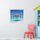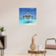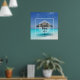 Une affiche avec l'image tropicale d'une mer turquoise avec une plage de sable blanc et un seul parasol en chaume. La typographie dit Beach Bum.