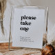Cette typographie noire moderne s'il vous plaît prendre une faveurs affiche est parfait pour un mariage simple. Le design minimaliste noir et blanc présente une police rétro mais contemporaine, avec une atmosphère bohème rustique unique. Parfait pour toute saison. Gardez-le minimal, en l'état, ou ajoutez vos propres graphiques et illustrations.