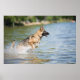 Un chien berger allemand excité saute dans l'eau en plein air par une journée ensoleillée.