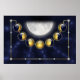 Ce design étincelant illustre le cycle lunaire en or brillant et bleu profond. Les bijoux représentant les phases de la lune courent en demi-cercle, du croissant épilé au premier trimestre, du gibbbous épilé, de la pleine lune, du gibbbous en déclin, du dernier quart, et se terminant sur un croissant en déclin. Ils sont placés sur un fond fractal comme le ciel étoilé, avec une photo de lune argentée de la NASA pour compléter la pièce.