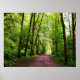 Photographie de la nature en couleur dans un format d'affiche, montrant un sentier forestier verdoyant. De grands arbres bordent les deux côtés, et la lumière du soleil applaudisse le sentier bien usé entre les feuilles. Cette photographie pourrait aussi être utilisée pour de nombreux messages motivationnels ou spirituels.