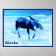 Image monochrome (bleu) d'une vache orignal marchant dans la neige. Le texte "Alaska" apparaît également. Les orignaux sont des résidents à l'année dans de nombreuses collectivités du Nord. Ici à Anchorage il y a environ 1500 animaux, ainsi que des loups, des ours bruns et d'autres animaux sauvages.Ils sont généralement bien élevés. Ils traversent souvent les rues aux passages piétons après avoir attendu un signal de marche.
