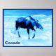 Image monochrome (bleu) d'une vache orignal marchant dans la neige. Le texte "Canada" apparaît également. Les orignaux sont des résidents à l'année dans de nombreuses collectivités du Nord. Ici à Anchorage il y a environ 1500 animaux, ainsi que des loups, des ours bruns et d'autres animaux sauvages.Ils sont généralement bien élevés. Ils traversent souvent les rues aux passages piétons après avoir attendu un signal de marche.