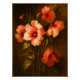 Un bouquet vibrant de fleurs d'hibiscus émerge d'un fond riche et terreux, leurs délicats pétales corail rayonnant de chaleur et de vie. Le jeu d'ombres et de lumières crée une impression de profondeur et d'élégance, capturant la beauté éphémère de la nature dans un style pictural intemporel.
