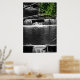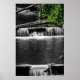 Photo en noir et blanc d'une petite rivière et d'une cascade avec une touche de vert dans les feuilles accrochés au-dessus.