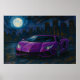 A sleek purple Lamborghini Aventador commands the foreground of this moonlit urban dreamscape, its aerodynamic silhouette bathed in soft lunar glow. Parked on a shadowed city street beneath a star-strewn sky, the car’s gleaming surface reflects the distant skyline—tall buildings silhouetted against the night, their windows flickering like constellations. The full moon looms large, casting a silvery light that dances across the pavement and accentuates the car’s sharp contours and luminous headlights.