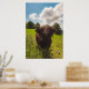 Vache noire des hautes terres pâturant le soleil du champ vert. Photographie d'une majestueuse vache écossaise noire des montagnes sur un terrain vert d'été avec de l'herbe en bouche et des fleurs chicorées devant. Dans l'arrière - plan il y a un beau ciel bleu et nuageux. Disponible sur de nombreux produits allant des imprimés aux fournitures de fête et aux équipements sportifs.