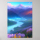 Cette magnifique pièce d'art numérique offre une vue imprenable sur une belle vallée du haut d'une colline. Au centre de la vallée, une belle rivière serpente à travers le paysage, partiellement recouverte d'une fine brume bleue qui crée une atmosphère éthérée et insolite.