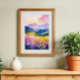 Cette peinture d'aquarelle sereine vous invitation dans un paysage paisible et rêveur. Des couleurs douces et pastel recouvrent un ciel magnifique sur des montagnes superposées, tandis qu'un champ animé de fleurs sauvages roses, violets et jaunes donne vie aux collines. Parfait pour ajouter une touche de calme et de beauté naturelle à toute chambre.