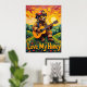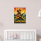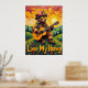 Ce magnifique tableau représente un ours habillé comme pompier, portant des lunettes de soleil et un casque, montant une guitare acoustique, assis sur un canon herbacé dominant une vallée pittoresque sous un coucher de soleil chaud et coloré. Parmi les fleurs sauvages. Les coups de pinceau épais et texturés rehaussent la nature capricieuse et douce de la scène, avec "Love My Honey" en évidence.