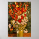A vase filled with a variety of colorful gladioli and carnations, including red, pink, and white blooms. The background features textured brushstrokes in green tones.