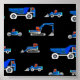 arrière - plan noir avec camions à benne de construction bleu, blanc et rouge, tracteurs, pelles, rouleau
