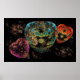 3 coeurs fractaux flottants avec des formes et des motifs de style steampunk / renaissance ornés. Les couleurs du coeur sont un bleu et vert qui se mêlent, orange et jaune, violet et rose. L'image a un tissu velouté doux / tissu look.