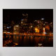 Une photo de l'horizon de Pittsburgh la nuit. Le ciel est noir et les lumières dorées brillent des bâtiments, reflétant l'eau de la rivière. Cette photo a été prise au sommet du Mont Washington pendant l'été.