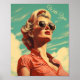 Revenez dans le temps avec cette magnifique affiche d'art, un hommage à l'époque dorée du glamour hollywoodien. La pièce présente un portrait saisissant d'une femme exsudant l'élégance classique des années 1950. Ses cheveux sont stylisés dans une vague chic et sculptée, rappelant les étoiles emblématiques du milieu du siècle. Des lunettes de soleil rondes et surdimensionnées lui donnent un air de mystère et de sophistication, tandis que son rouge à lèvres audacieux offre une couleur éclatante qui se distingue par son arrière - plan bleu ciel serein. Le regard vers le haut et la pose confiante du sujet sur fond de nuages doux évoquent un sentiment d'aspiration et l'allure intemporelle de la mode vintage. Les teintes chaudes de sa chemise de corail avec des points de col pointus accentuent son décolleté, ajoutant à l'atmosphère rétro générale de l'affiche.