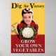 Notre joyeuse affiche de 2ÈME GUERRE MONDIALE britannique vintage présente une jolie brune avec un grand sourire sur le visage tandis qu'elle montre triomphalement son légume primé, un chou-fleur nutritif cultivé dans son propre jardin à la maison. Elle a une coiffure de style Quarties et est habillée d'une chemise rouge colorée. Elle s'appuie sur une clôture de jardin rouge à côté de ses outils de jardinage, un râteau et une canette. La légende dit : Creusez pour la victoire. Cultivez vos propres légumes. L'affiche a été produite par le British War Information Office pendant la Seconde Guerre mondiale afin d'encourager les gens à contribuer à l'effort de guerre et à réduire les pénuries alimentaires en cultivant leur propre nourriture chez eux. L'affiche serait le cadeau idéal pour les jardiniers et les détenteurs d'allocations. Vous pouvez customiser l'affiche en ajoutant votre propre choix de bordure en couleur simplement en utilisant le bouton personnaliser.