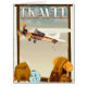 Poster Vintage voyage - Ancien poster de vacances classique d'un avion léger volant, il y a un sac à dos au premier plan il est encadré par du bois ancien.