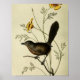 Illustration vintage d'un moulu Wren perché sur une branche délicate avec de petites fleurs jaunes avec arrière - plan crème. Ce tableau a été réalisé à l'époque victorienne, 1862 par l'artiste et ornithologue américain John Cassin.