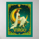 Poster dans une femme en robes blanches coulantes, avec une fleur dans les cheveux, assise gracieusement sur une lune d'or croissant, entourée d'étoiles. Le cadre Art Nouveau orné de fleurs et le mot "VIRGO" complètent l'illustration du zodiaque céleste.