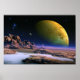 Un paysage spatial avec une grande planète verdâtre et des étoiles.