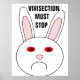 Cette affiche présente le triste visage d'un lapin blanc. Ce lapin a une grosse fronde sur son visage parce qu'il est un lapin de laboratoire qui a fait l'objet de tests cosmétiques. Les blancs de ses yeux sont rouges et enflés. Le design a été conçu pour attirer l'attention sur les souffrances inutiles causées par les tests de cosmétiques sur les animaux. Le texte noir et gras entre les oreilles du lapin dit "la vivisection doit s'arrêter". L'affiche est disponible en plusieurs tailles différentes, dont la plus grande est montrée ici. Mettez-le à la maison ou au travail et soutenez les droits des animaux.