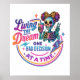 Design coloré et dynamique, avec un squelette féminin avec ses cheveux dans un arc et tenant une tasse de café. Le texte coloré dit : "Vivre le rêve une mauvaise décision à la fois". Ce design est disponible sur une grande variété de produits.