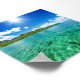 Une vue imprenable sur l'eau cristalline de l'océan avec des rochers sous-marins visibles, encadrée par une île tropicale luxuriante avec des montagnes verdoyantes sous un ciel lumineux et ensoleillé. La scène vibrante capture la beauté d'un paradis tropical serein et accueillant.