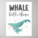 Belle pépinière à thème nautique et affiche de chambre pour enfants avec une illustration peinte à la main d'une mère et d'une baleine. Il y a des bulles et des coeurs roses. Le texte de typographie dit "salut à la baleine là !"