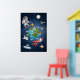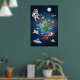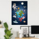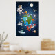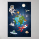 What’s happening around planet earth, a view from space. Poster image with rocket, astronaut, satellite, moon, etc...