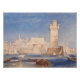Rhodes. Joseph Mallord William Turner (1775 - 1851). Un beau paysage marin dans les tons rose et bleu. Au premier plan se trouvent des bateaux et des bateaux dans la baie près des remparts de la ville. au milieu se trouve une haute tour. Dans l'arrière - plan il y a une ville avec des maisons en pierre. Reproduction d'oeuvres d'art célèbres dans le domaine public.