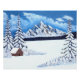 A poster with a beautiful winter scene including snowy mountains, rustic cabin and snow covered evergreens. Original artwork by W.B.
