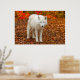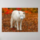 Un majestueux loup blanc aux yeux bleus piercing se dresse gracieusement sur un lit de feuilles d'automne. Les riches rouges, oranges et jaunes de l'arrière - plan créent un contraste saisissant avec sa fourrure immaculée. La présence du loup, calme et puissante, évoque l'esprit de l'automne lui-même.